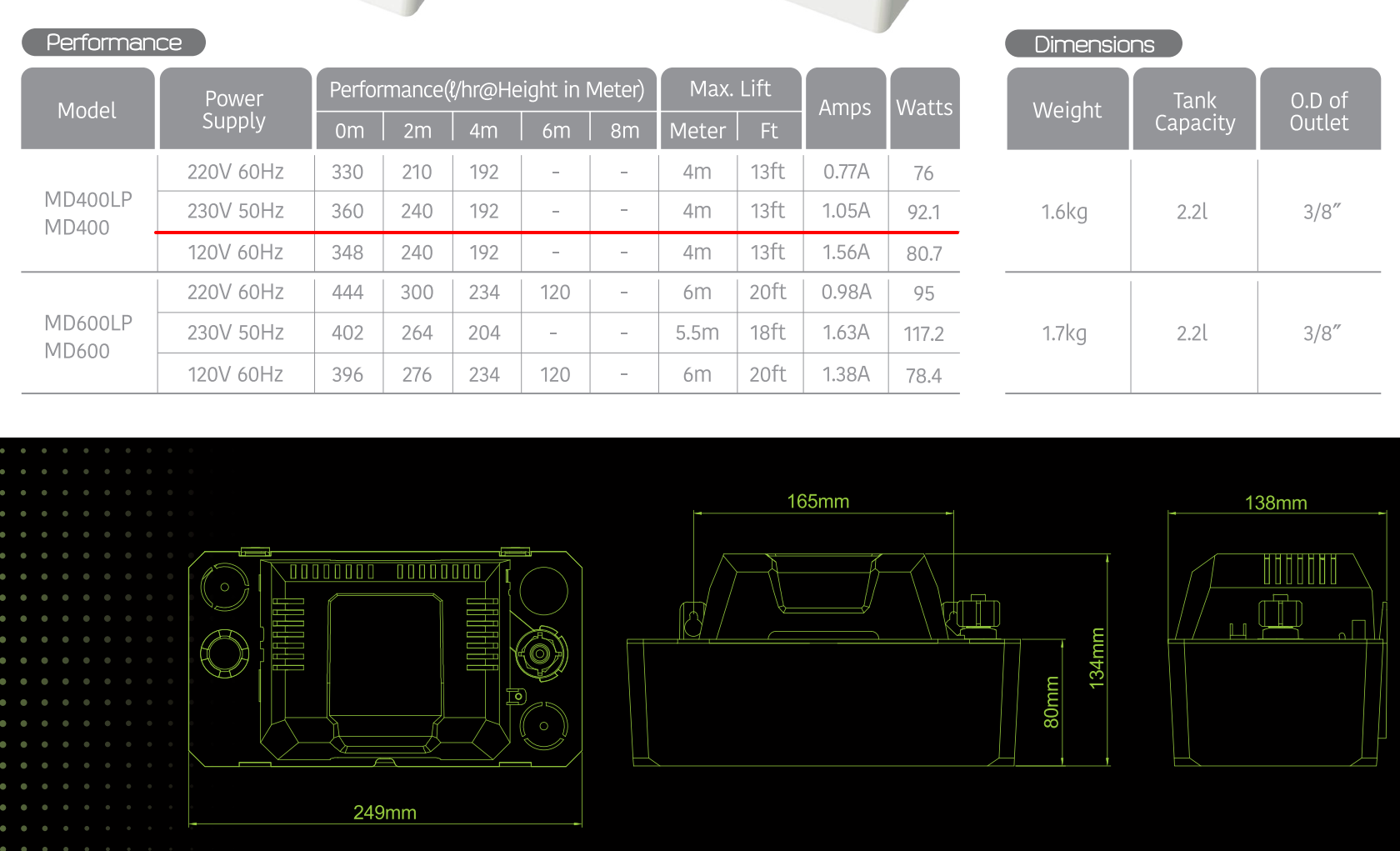 Thông số Máy bơm nước thải máy lạnh Microdam MD400LP: